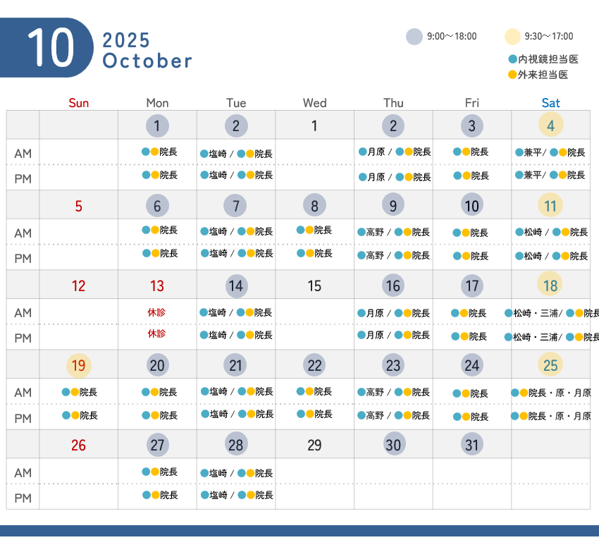 9時30分より17時まで、内視鏡検査・外来診療を行っております。