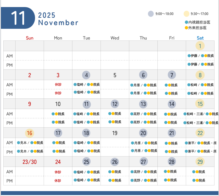11/3(金)、11/23(木)は祝日のため休診日となります。
