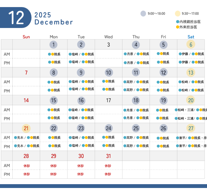 12月 診療日・担当医カレンダー event_note2025.10.31 12月の診療日、担当医は以下の通りです。 よろしくお願いいたします。 2025/12/28~2026/1/4は年末年始により休診となります。 ご迷惑をおかけいたしますが、どうぞよろしくお願いいたします。